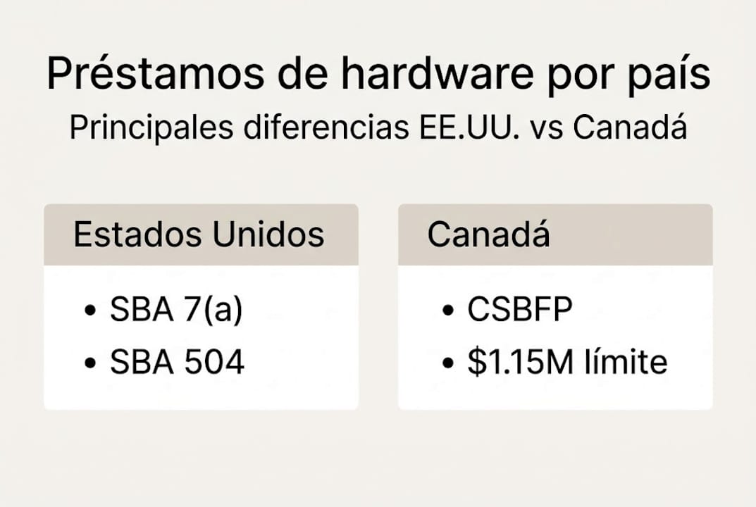 En EE.UU. destacan los préstamos SBA con hasta $5M, mientras que en Canadá el programa CSBFP ofrece hasta $1.15M con condiciones favorables para empresas nuevas, con tiempos y documentación distintos en cada país.