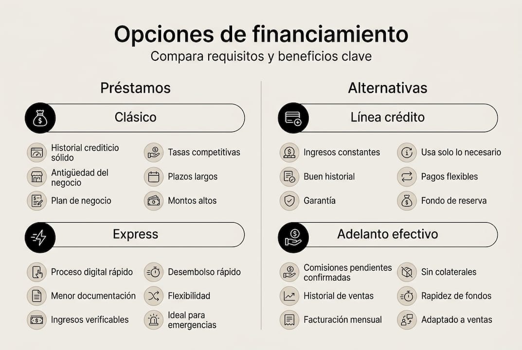 Para agentes nuevos con historial limitado, las líneas de crédito empresariales y adelantos de efectivo mercantil suelen ser más accesibles que préstamos tradicionales. Estos productos requieren menos documentación histórica y se enfocan más en tu potencial de ingresos futuros. Comienza con montos menores para construir tu historial de pagos, lo que te abrirá acceso a financiamiento mayor posteriormente.