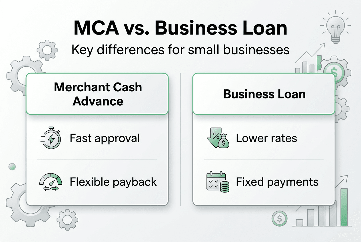 A merchant cash advance purchases your future receivables and repays through a percentage of daily sales, while a business loan provides debt capital repaid through fixed installments. MCAs avoid lending regulations because they're structured as sales, not loans. This means different legal protections, typically higher costs, and flexible repayment tied to your revenue. Traditional loans offer regulated interest rates, predictable payments, and stronger borrower protections under lending laws.