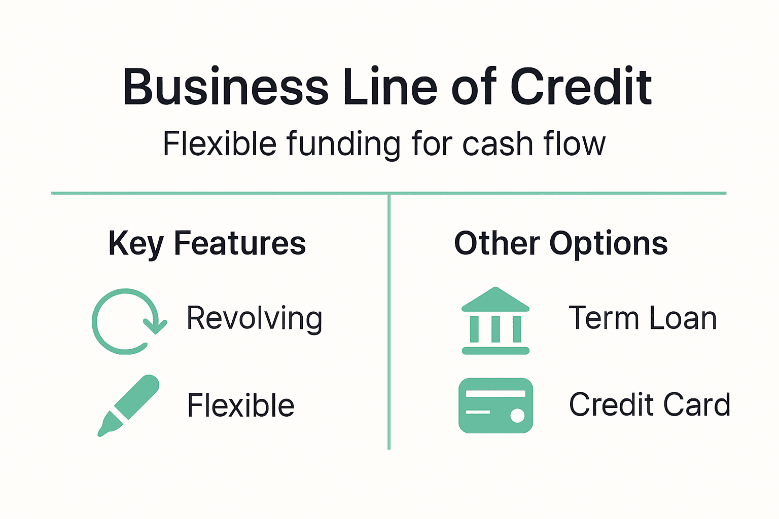 | Feature | Line of Credit | Term Loan | Credit Card | Merchant Cash Advance |